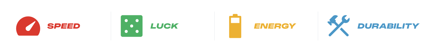 모든 NFT는 스피드, 행운, 에너지, 내구성 등 네 가지 특성의 능력치를 보유하고 있습니다.