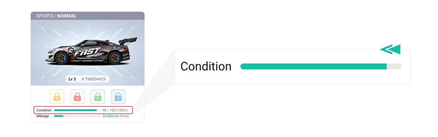 모든 NFT에는 ‘컨디션’이라는 속성이 있으며, 초기에는 100에서 시작합니다.