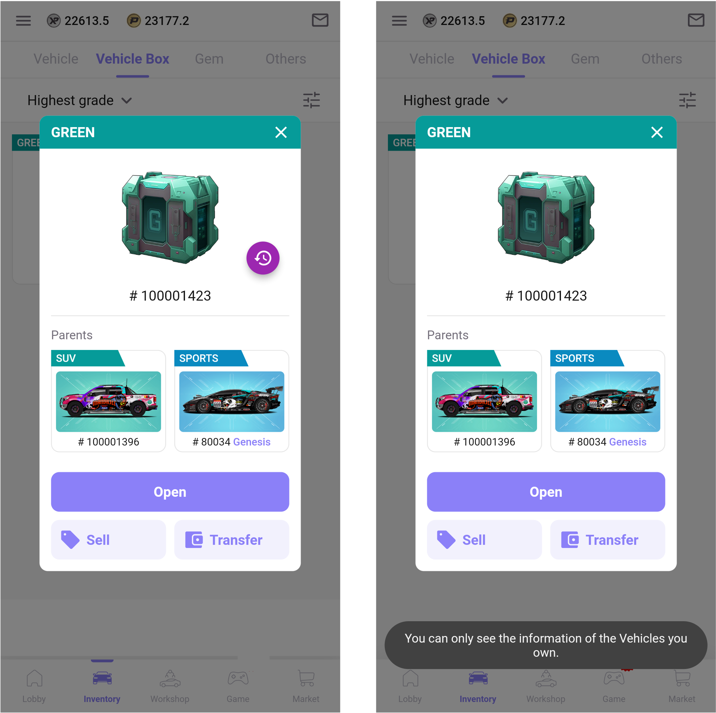 브리딩을 진행하면 차량 박스를 획득할 수 있습니다. 박스에는 열기 전에 양쪽 부모의 정보가 포함되어 있습니다.