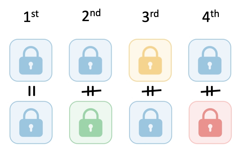 브리딩을 통해 획득한 NFT의 소켓은 4개 모두 순차적으로 양쪽 부모가 가진 네 개의 소켓을 기반으로 결정됩니다. 즉, 새로운 NFT의 첫 번째 소켓 색상은 양쪽 부모의 첫 번째 소켓 색상을 기초로 결정되며, 두 번째 소켓은 양쪽 부모의 두 번째 소켓 색상에만 영향을 받습니다. 적용되는 확률은 양쪽 부모가 가진 각 소켓의 색상이 같은지 여부에 따라 달라집니다. 아래는 예시입니다: