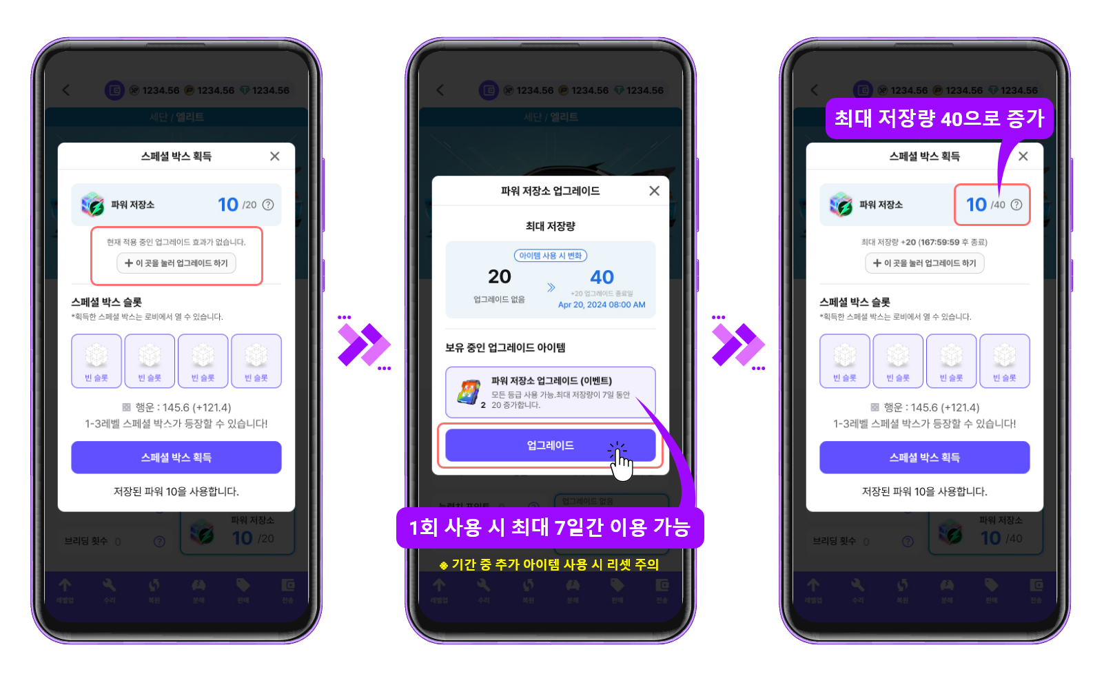 📌 ‘파워 저장소 업그레이드 아이템 사용 중 추가 사용 시, 남은 기간이 모두 리셋 (기간 연장 X)