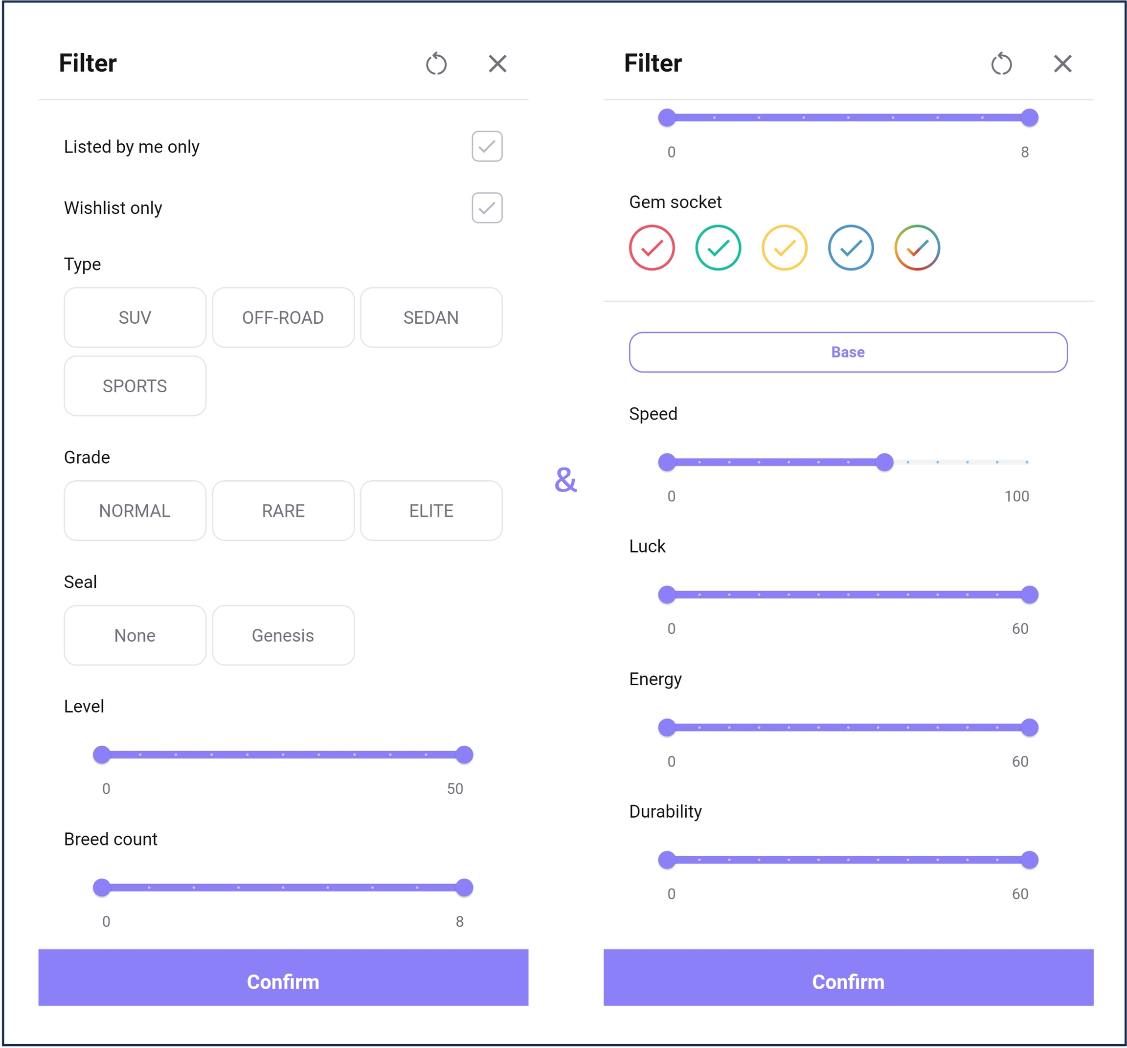 NFT 섹션에서는 필터를 사용하여 아이템을 검색할 수 있습니다. 차종, 등급, 제네시스 여부뿐만 아니라 레벨, 브리딩 횟수, 보석 소켓 수, 기본 능력치 등 다양한 기준으로 검색할 수 있습니다. 또한 등록한 아이템이나 위시리스트의 아이템을 따로 검색하여 NFT를 쉽게 찾을 수도 있습니다.