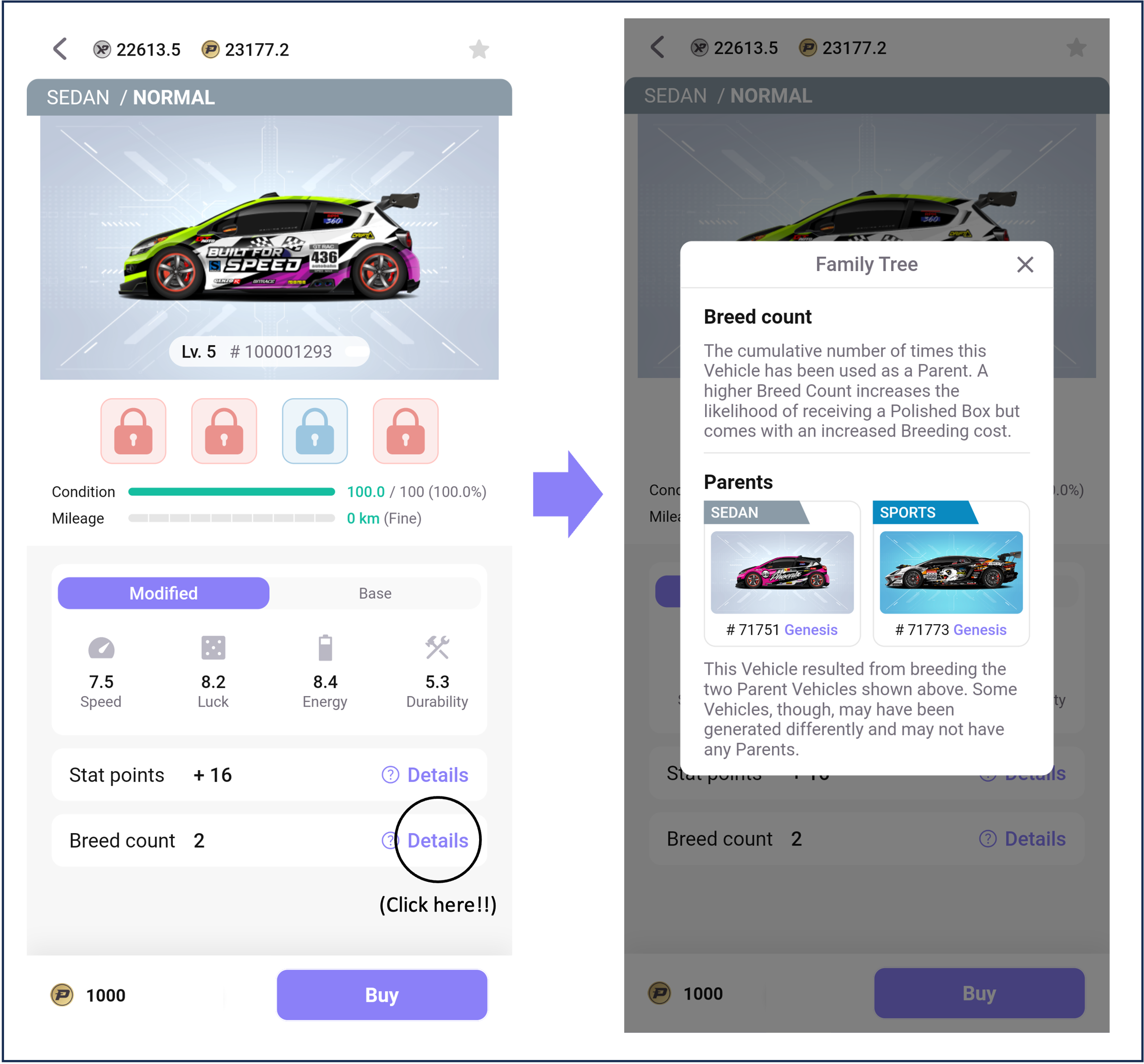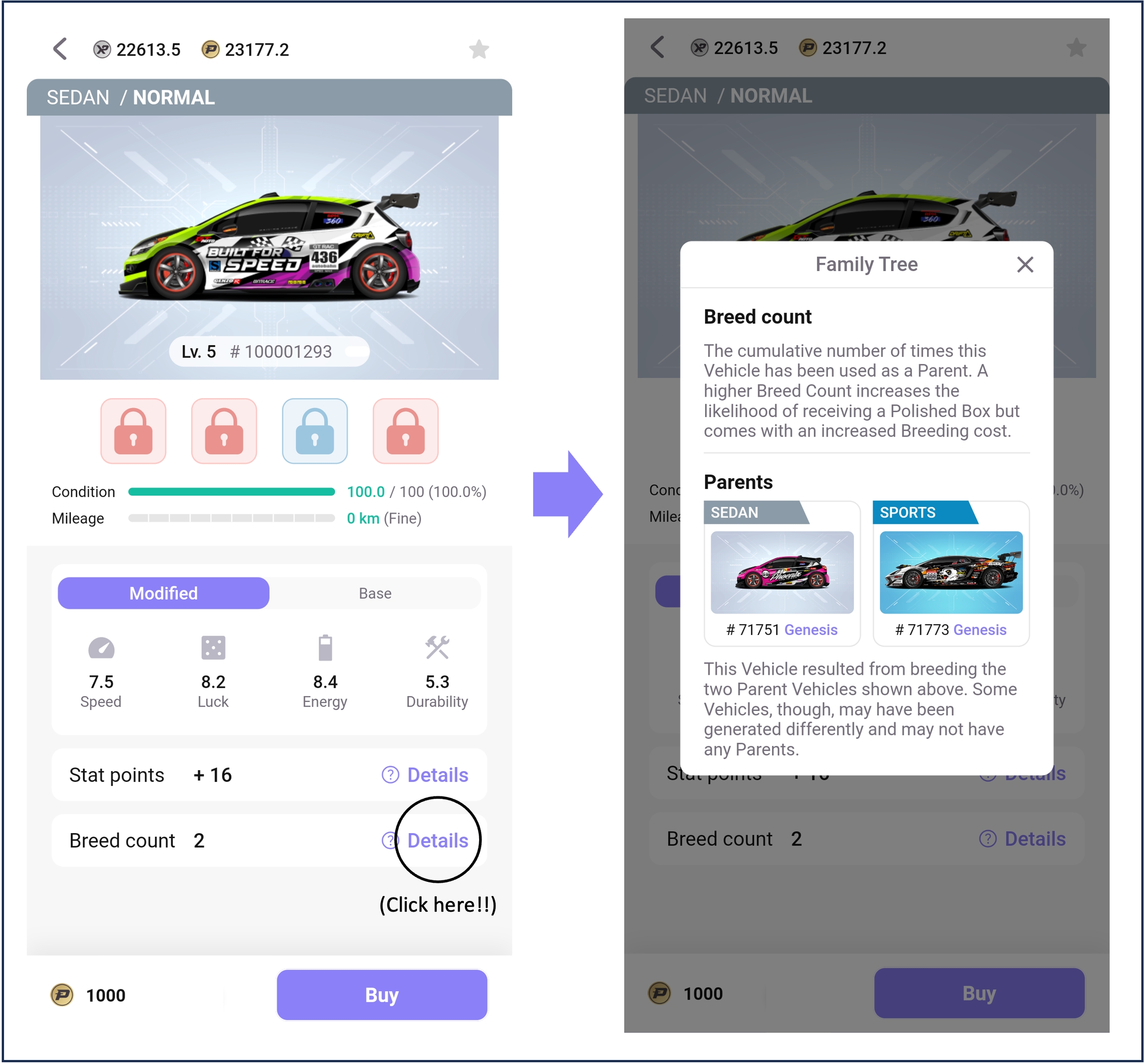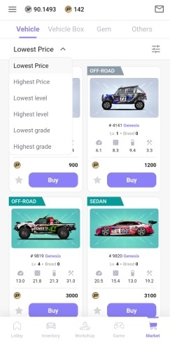 NFT는 기본적으로 가격이 낮은 순서대로 정렬되지만, 등급이나 레벨과 같은 기준을 기반으로 목록을 정렬할 수도 있습니다. NFT에 대한 자세한 정보는 [능력치], [차종], [등급] 등의 섹션을 참조하세요.
